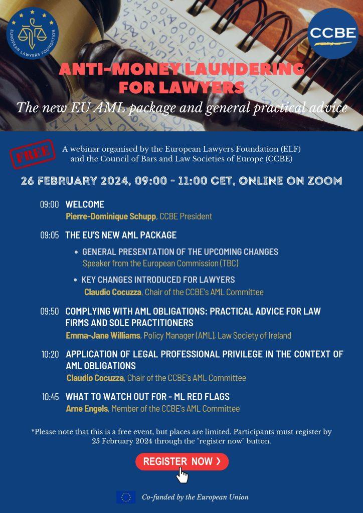 sporočamo vam, da bo ELF (European Lawyers Foundation) v sodelovanju s CCBE organizirala spletni seminar z naslovom ”Preprečevanje pranja denarja za odvetnike. Novi paket EU AML in splošni praktični nasveti” (Anti-money laundering for lawyers. The new EU AML package and general practical advice), in sicer v četrtek 26. februarja 2024 ob 9.00.