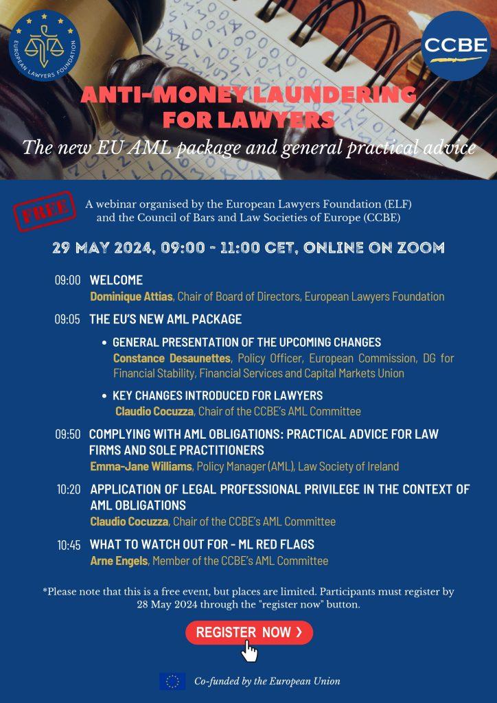 sporočamo vam, da bo ELF (European Lawyers Foundation) tokrat s Council of Bars and Law Societies of Europe ponovno organiziral že drugi spletni seminar z naslovom ”Preprečevanje pranja denarja za odvetnike. Novi paket EU AML in splošni praktični nasveti” (Anti-money laundering for lawyers. The new EU AML package and general practical advice), in sicer v sredo 29. maja 2024 ob 9.00 uri.
